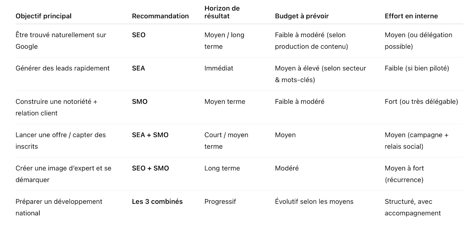 Le digital fonctionne comme un écosystème. Un bon article de blog (SEO) peut nourrir vos posts LinkedIn (SMO). Une pub Google bien ciblée (SEA) peut rediriger vers une page qui valorise votre expertise SEO. Tout est affaire d’orchestration.